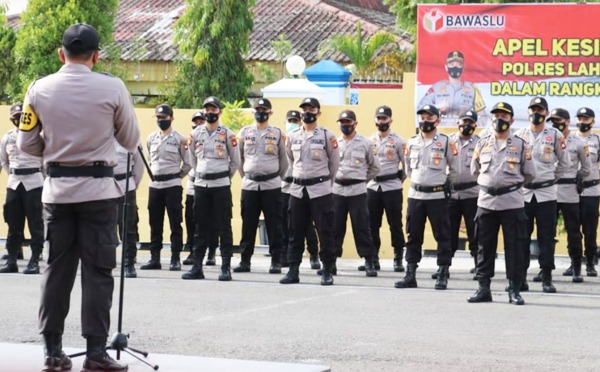 Tampak Kapolres Lahat AKBP Achmad Gusti Hartono SIK memimpin apel diikuti oleh Wakapolres Kompol josy Andrianto SST MM, Kabag Ops Kompol Sunarso SH, Kabag Sumda Kompol M Nuh SH, Kabagren Kompol Soerahmad, Para Kasat dan Perwira Polres Lahat serta Komisioner KPU dan Bawaslu Lahat.