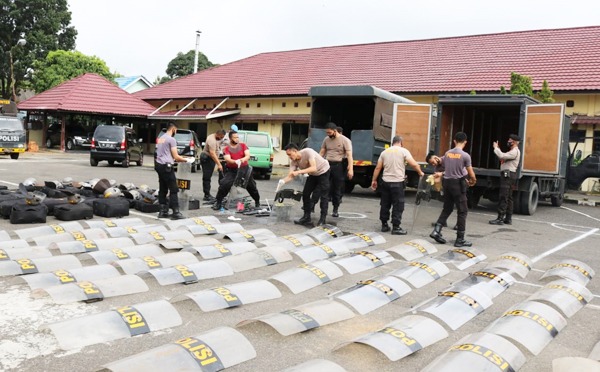 Terlihat satu persatu peralatan Dalmas yang dimiliki oleh Sat Sabhara Polres Lahat yang terjejer rapi di atas lapangan apel Polres Lahat diperiksa mulai dari mulai dari rompi dalmas, tongkat dan tameng dalmas.