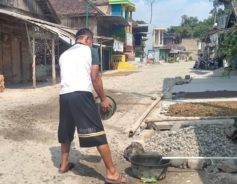 Warga setempat menyiram jalan di depan rumah masing-masing menggunakan ember untuk meminimalisir terjadinya polusi debu yang mengancam kesehatan mereka.