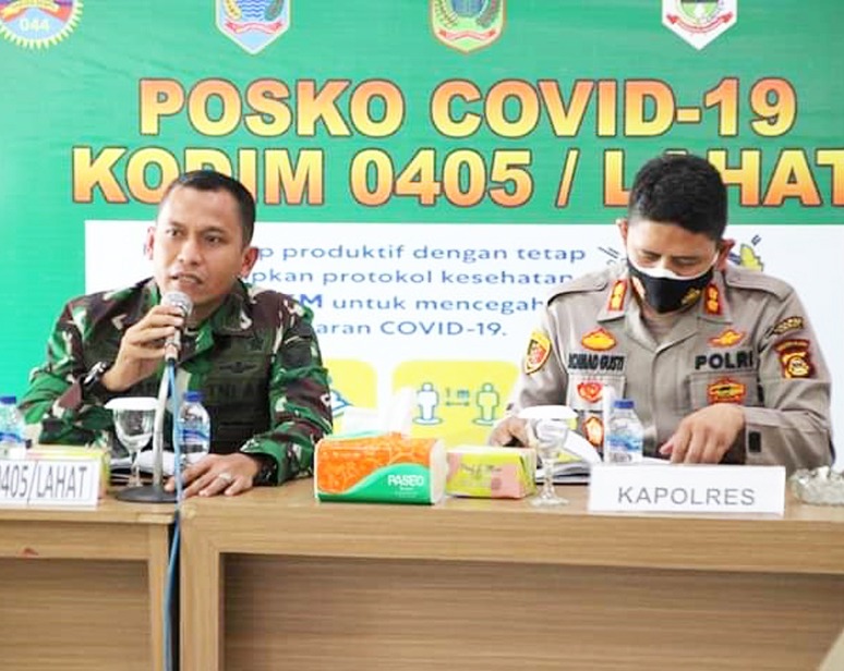 Rakor beragenda penaggulangan Covid-19 dihadiri langsung Dandim 0405/Lahat Letkol Kav Shawaf Al-Amien beserta jajarannya, Kapolres Lahat AKBP Achmad Gusti Hartono SIK, Asisten 1 Setda Lahat, Ka BPBD Lahat, Kasat Pol PP dan Damkar, Kepala Dinas Kesehatan, Dirut RSUD Lahat.