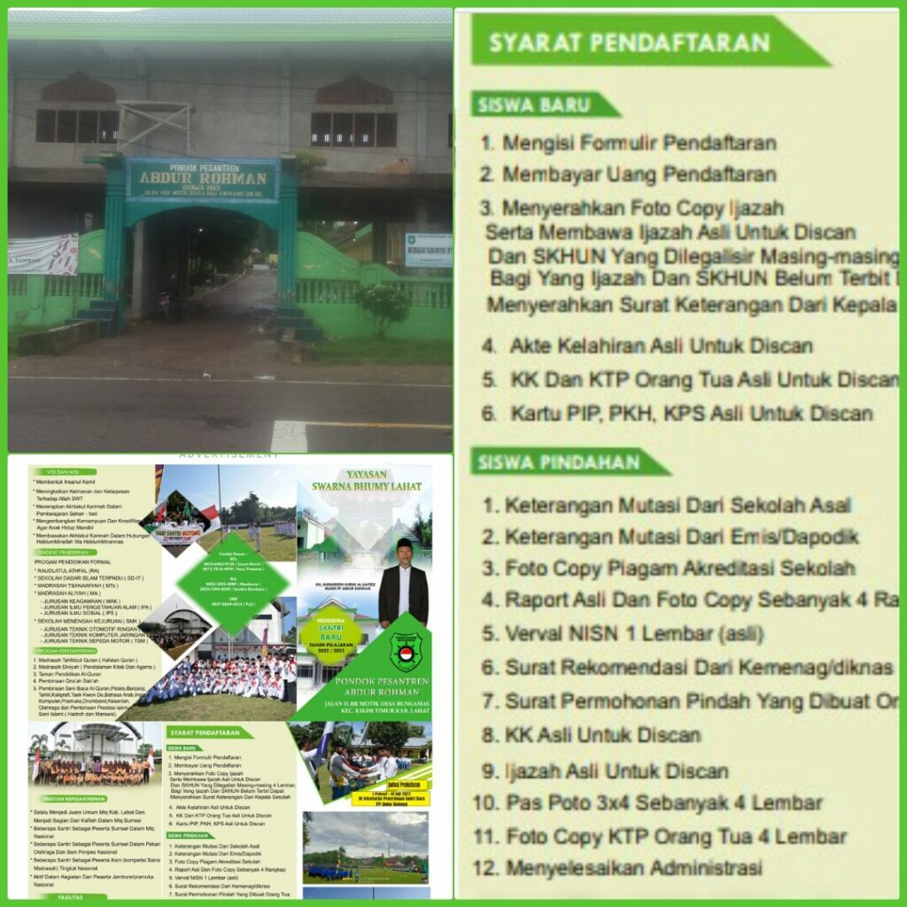 LAHAT SUMSEL – MLCI – Pondok Pesantren Abdur Rohman yang berada di Kecamatan Kikim Timur, Kabupaten Lahat,Provinsi Sumatra Selatan – Membuka Pendaftaran Santri, Untuk Tahun Ajaran 2022/2023 Pada, Tanggal 1 Februari-10 juli 2022. Rabu,12//01//2022 pukul, 12.49 Wib