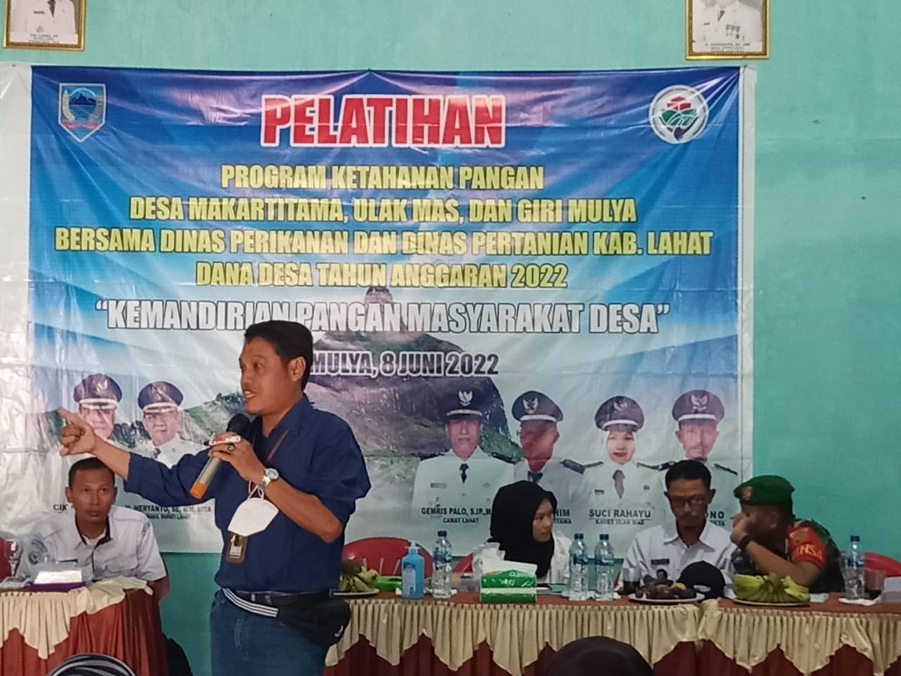 LAHAT SUMSEL, MLCI – Pelatihan Program ketahanan Pangan Desa Makartitama, Ulak Mas dan Giri Mulya – Bersama Dinas Perikanan dan Dinas Pertanian Kabupaten Lahat, Dana Desa (DD) Tahun Anggaran 2022 Dengan Tema “Kemandirian Ketahanan Pangan Masyarakat Desa” yang digelar Di Gedung Serbaguna Desa Giri Mulya, Rabu, 08//06//2022