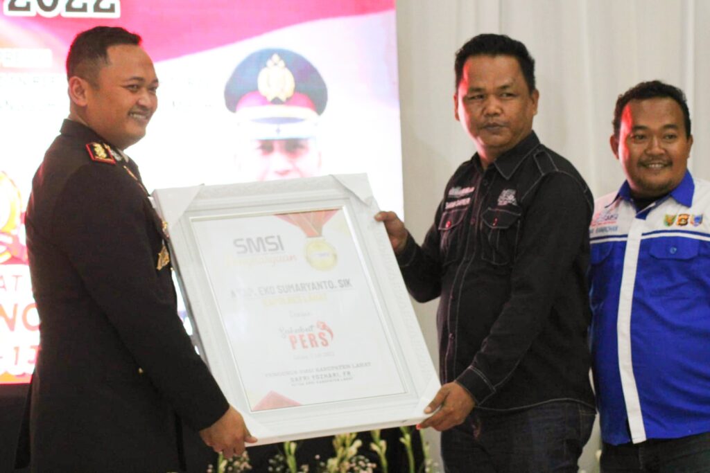Penghargaan itu secara langsung diberikan kepada Kapolres Lahat oleh ketua SMSI Lahat. Dafri Yozhri FR di dampingi Ketua Bidang Orgnisasi SMSI Sumsel Ishak Nasroni Sp yang berlangsung di acara perayaan Hut Bhayangkara ke-76 tahun 2022 di Gedung Kesenian Lahat.