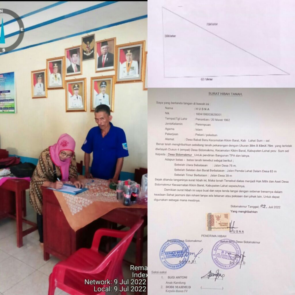 Kikim Barat, LAHAT SUM-SEL,- MLCI – Penyerahan Surat Hibah sebidang tanah pekarangan berukuran 39 M x 63 M x 75 M yang berada di dusun 4 (empat) Desa Sidomakmur, kecamatan kikim barat, Kabupaten Lahat, Provinsi Sumatra selatan – Untuk pembangunan TPA dan lainnya Berjalan lancar. Sabtu, 09//07//2022