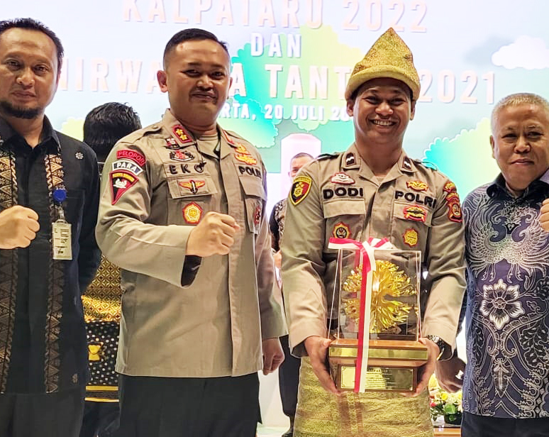JAKARTA, MLCI – Didampingi Kapolres Lahat AKBP Eko Sumaryanto SIK, personil Aipda Dodi Permana SH MM menerima penghargaan Kalpataru tahun 2022 di Auditorium Gedung Manggala Wanabakti Jakarta Pusat. Rabu (20/7/2022).