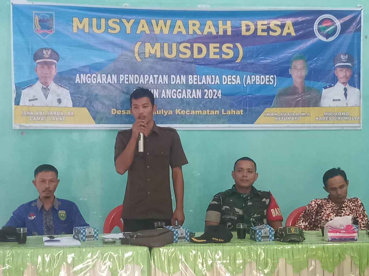 Kepala Desa Giri Mulya Mujiono dalam sambutannya mengatakan bahwa pelaksanaan Musdes RKPDes mengacu pada Permendagri nomor 114 tahun 2014 tentang Pembangunan Desa dan Permen Desa PDTT nomor 16 Tahun 2019 tentang Musyawarah Desa.