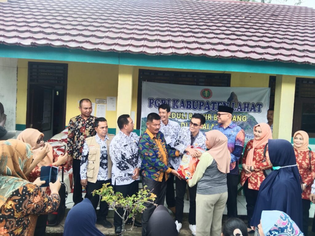 LAHAT SUMSEL – MLCI – Bertempat di Desa Nanti Giri Kecamatan Jarai Kabupaten Lahat tepatnya diSMP Muhammadiyah 107 Jarai, Dinas Pendidikan dan Kebudayaan Kabupaten Lahat Bersama ketua PGRI Lahat Serahkan Bantuan berupa sembako dan uang tunai Kepada Korban Bencana Banjir.