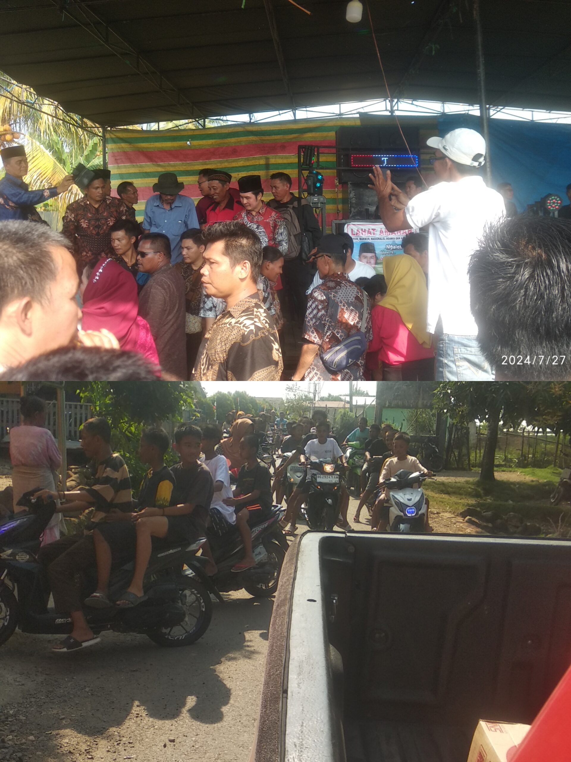 LAHAT SUMSEL – MLCI – Yulius Maulana ST Calon Bupati Lahat didampingi Ketua Tim Pemenangan Darsi Bersama Rombongan menghadiri Resepsi Pernikahan Riska dan Asep di Desa Lubuk Betung Kecamatan Merapi Timur Kabupaten Lahat. Sabtu, 27/07/2024.