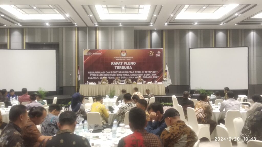 LAHAT SUMSEL – MLCI – Komisi pemilihan umum ( KPU) Kabupaten Lahat telah menetapkan jumlah daftar pemilih tetap (DPT) Kabupaten Lahat pada pemilu 2024 mendatang, rapat pleno berlangsung di Hotel Santika pada Jumat 20/09/2024.