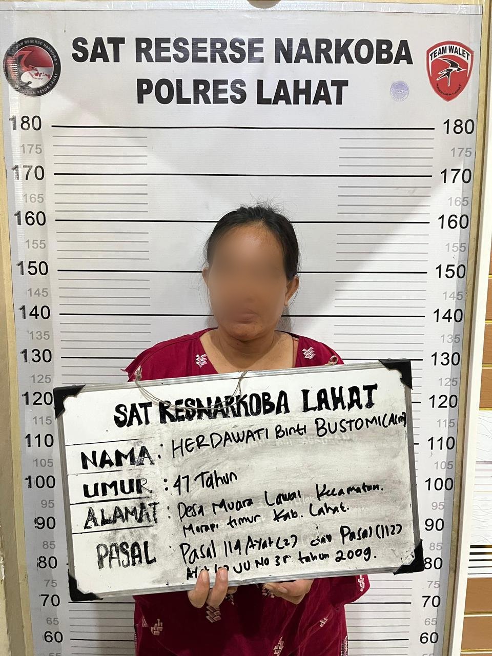 LAHAT SUMSEL, MLCI – HE seorang Ibu Rumah Tangga (IRT) warga Desa Muara Lawai Kecamatan Merapi Timur dinyatakan status hukum pengedar narkotika, setelah Tim Walet dipimpin Kasat Res Narkoba Iptu LAE Tambunan SH MH bersama Kanit IDIK I Ipda Noprianto SH menangkapnya.