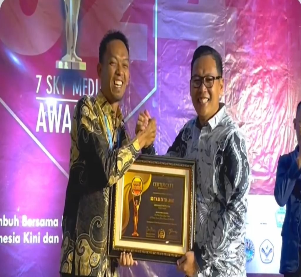 Tampak, penyerahan Piagam Penghargaan diserahkan langsung Oleh 7 Sky media dan Majalah IM Indonesia kepada Muhamad Hatta kepala sekolah SD A BA TA TSA Lahat.