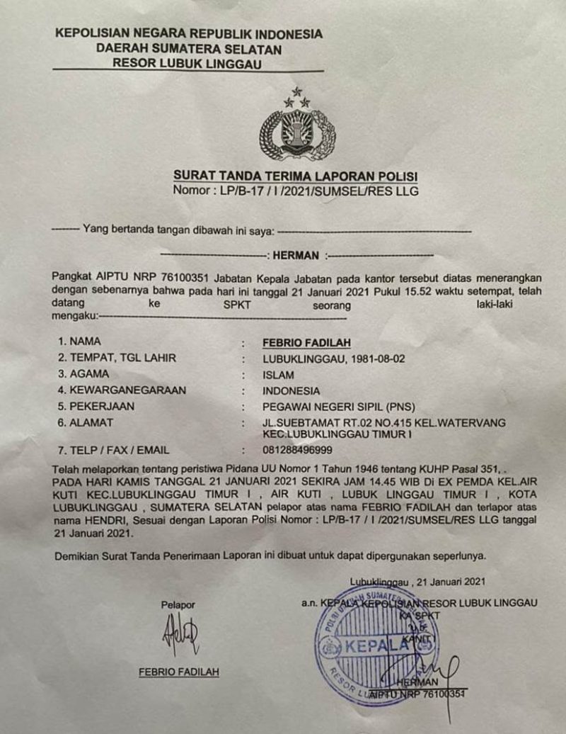 LUBUK LINGGU SUMSEL, MLCI – Aparatur Sipil Negara (ASN) Dinas Kominfo Kota Lubuklinggau, Febrio Fadilah (40), mendatangi Sentral Pelayanan Kepolisian (SPK) Polres Lubuklinggau, Kamis (21/1). Warga Jalan Sueb Tamat RT 02 No 415 Kelurahan Watervang Kecamatan Lubuklinggau Timur 1 yang juga diketahui penasehat SMSI Silampari ini, melaporkan Hi, yang diketahui oknum pejabat di Musi Rawas, dengan dugaan kasus penganiayaan.