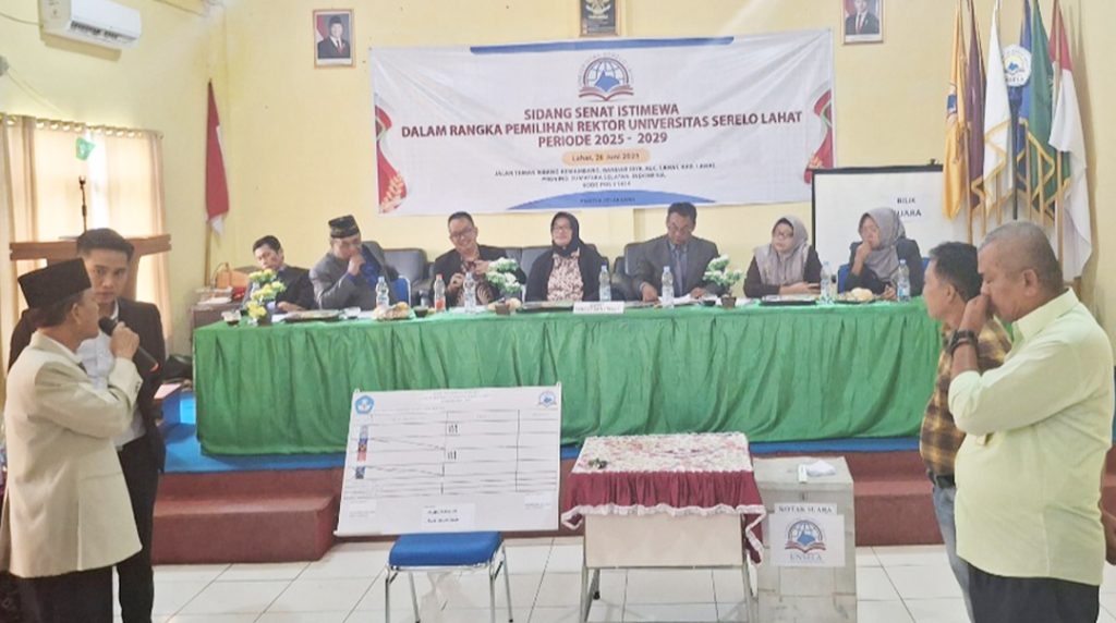 LAHAT SUMSEL, MLCI – Pemilihan Rektor Universitas Serelo Lahat (Unsela) periode 2025-2029 yang digelar dalam Sidang Senat Istimewa (SII) berakhir imbang di kampus Jalan Taman Ribang Kemambang Bandar Jaya Kecamatan Lahat. Kamis (26/6).