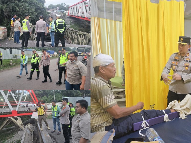 LAHAT SUMSEL, MLCI – Kapolres Lahat AKBP Novi Ediyanto SIK MIK didampingi Kabag Ops Kompol Toni Arman SH, Kasat Samapta AKP Heri Irawan SH MH, Kasat Lantas Iptu Dr Jhoni Albert SH MH MSI MM dan Kapolsek Merapi Iptu Candra Kirana SH MH meninjau langsung lokasi jembatan roboh