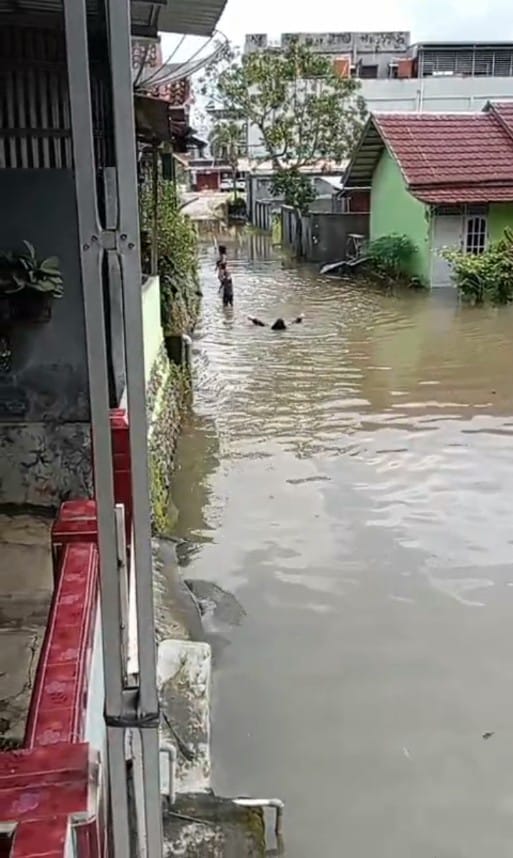 Banjir di sekitar permukiman warga itu besar kemungkinan diakibatkan oleh plat dekker atau saluran siring pembuangan air hujan (gorong-gorong) yang berlokasi tepatnya dibawah jalan raya depan BPJS amblas hingga menutup saluran.