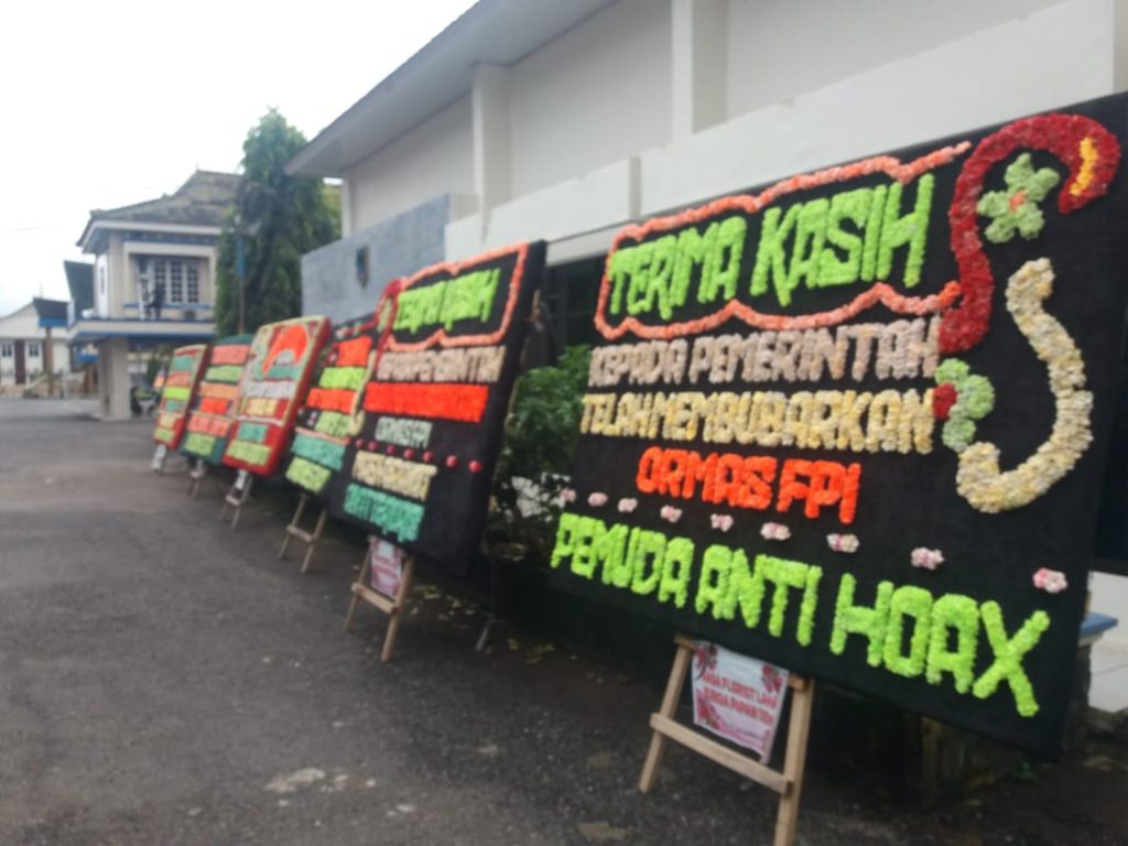 Salah satunya, karangan bunga yang dikirim oleh Pemuda Anti Hoax bertuliskan “Terima Kasih Kepada Pemerintah Telah Membubarkan Ormas FPI”.