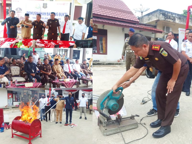 LAHAT SUMSEL, MLCI – Barang Bukti (BB) berkekuatan hukum tetap dari pengadilan atau Inkracht dimusnahkan Kepala Kejaksaan Negeri (Kajari) Lahat, Toto Roedianto SSos SH MH bersama Bupati Lahat H Bursah Zarnubi SE.