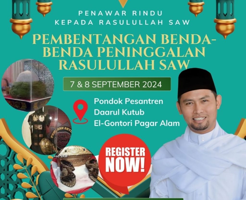 PAGARALAM SUMSEL, MLCI – Beberapa benda berharga pada diri Rasulullah akan ditampilkan pada momen bulan Maulid bulan Kelahiran Nabi Muhammad SAW yakni di bulan Rabiul Awal, berpusat di Pondok Pesantren Darul Qutub ElGontori Kota Pagaralam.