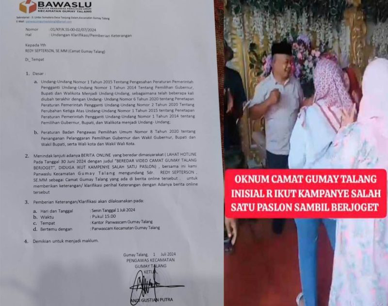 Dalam isi surat itu, Panwaslu meminta kehadiran Camat Gumay Talang guna mengklarifikasi terkait dugaan keterlibatannya ikut dalam acara salah satu kandidat Calon Bupati dan Wakil Bupati Lahat.