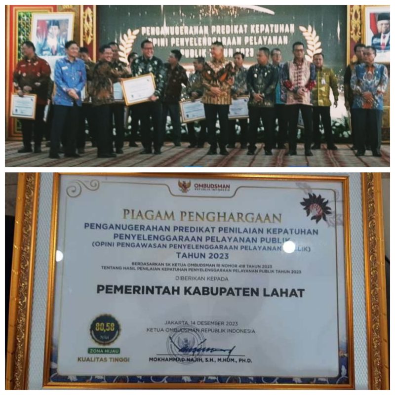 LAHAT SUSMEL – MLCI – Pemkab Lahat akhirnya Meraih Penghargaan Tingkat Nasional dengan predikat Kepatuhan Pelayanan Publik dengan nilai 80.58 persen kategori B dengan kualitas tingga (Zona Hijau).