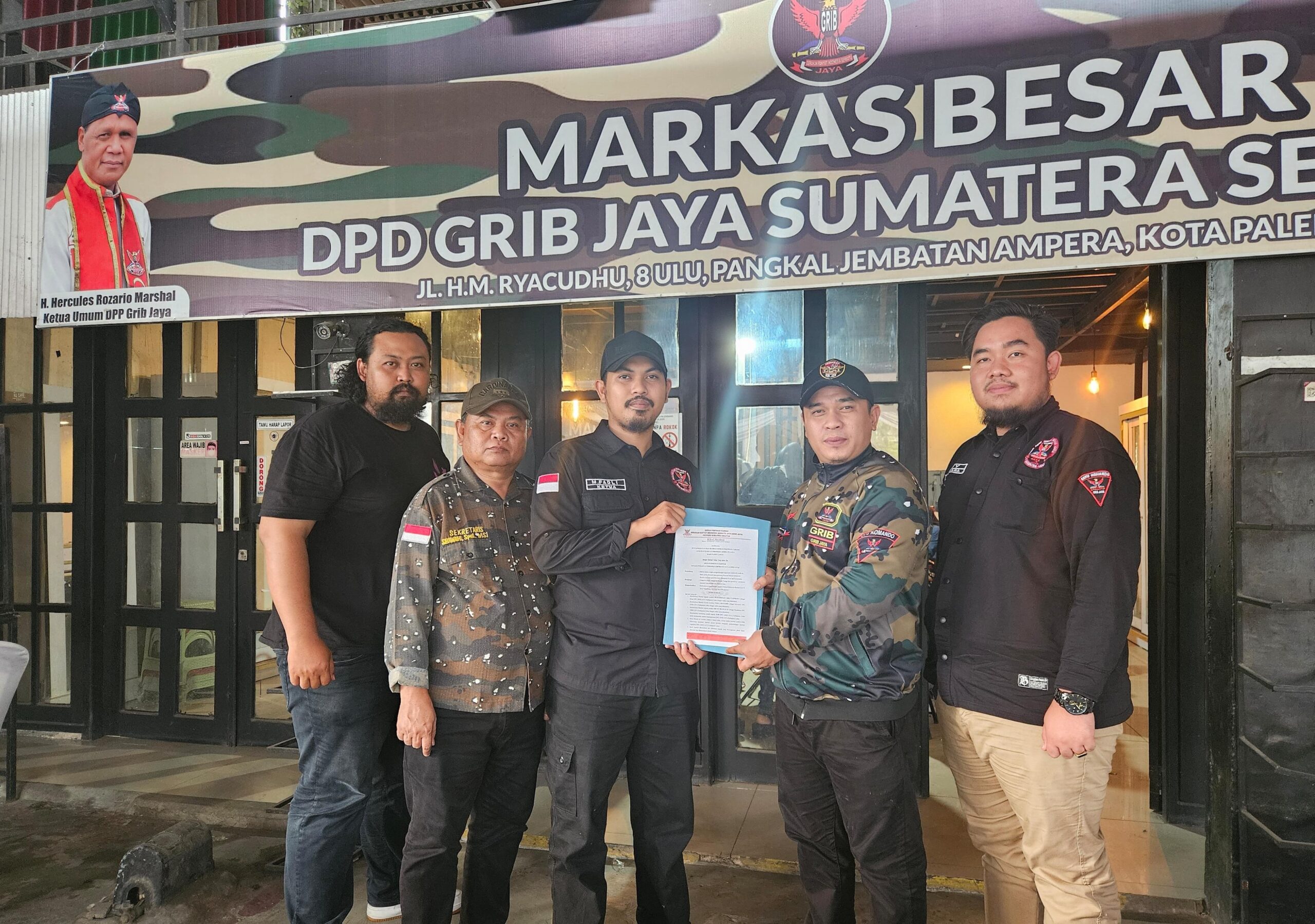 PALEMBANG, MLCI – Ketua Dewan Pimpinan Daerah (DPD) Gerakan Rakyat Indonesia Bersatu (GRIB) Jaya Provinsi Sumatera Selatan (Sumsel), Satria Amri Ramadhan SIP MM didampingi Sekertaris Sibawaihi SPdI MSi dan pengurus lainnya menyerahan SK terbentuknya Dewan Pimpinan Cabang (DPC) GRIB Jaya Kabupaten Lahat.