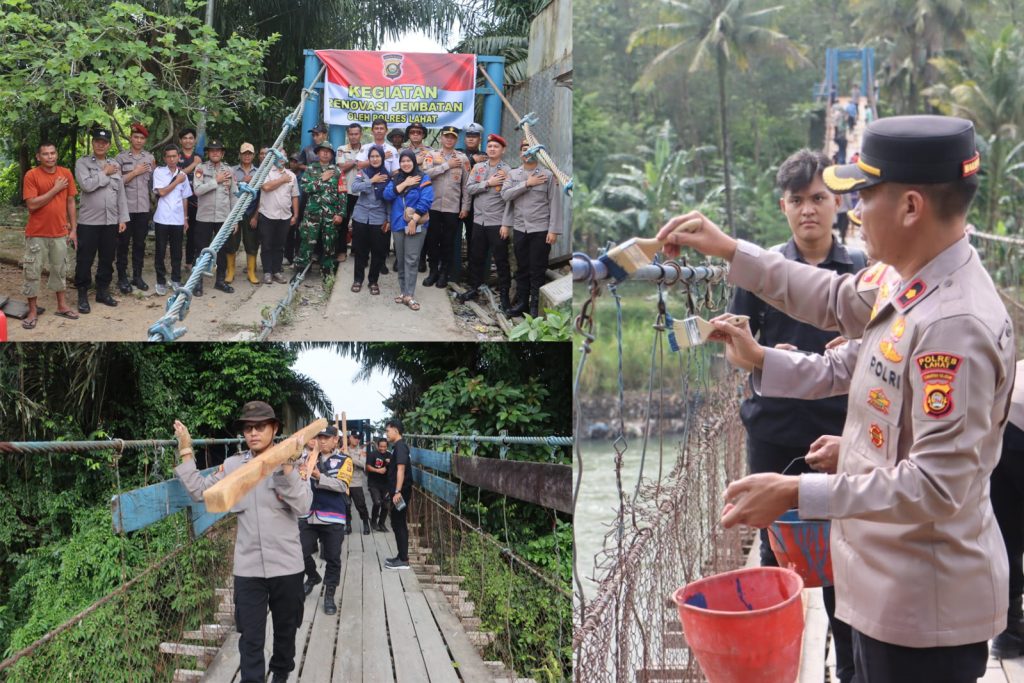Dengan turun langsung ke lapangan, personel Polres membantu proses pengangkatan material, pemasangan papan baru, hingga penguatan rangka jembatan agar lebih kokoh dan aman digunakan.