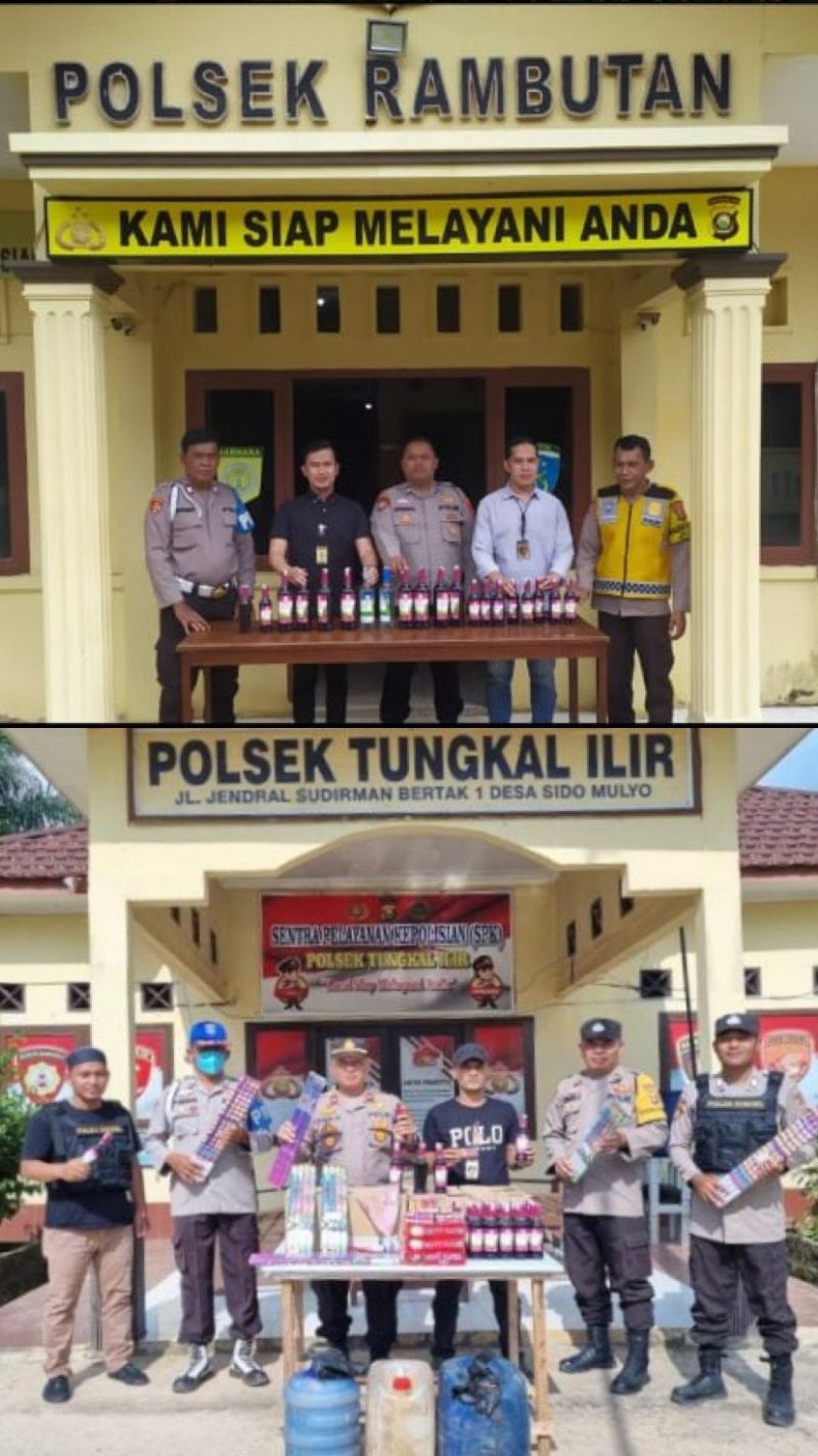 Alhamdullilah, dalam razia yang dilakukan terhadap para pedagang yang masih berjualan miras dan petasan berhasil berhasil mengamankan barang bukti Miras sebanyak 2 dus miras jenis Anggur Merah Kecil , 2 jerigen miras jenis tuak dan 1 galon jenis tuak Serta 7 ( pak petasan/mercon jenis kembang api dengan ukuran besar dan sedang merk Roman Candle, 4 (empat) pak petasan/mercon merk Happy Flower, 4 (empat) bungkus petasan/mercon kembang api terbang ukuran kecil, setelah di amankan personel Polsek Tungkal Ilir membawa dan menyimpan barang bukti tersebut di Gudang Mapolsek Tungkal Ilir, jelas Perwira Polisi ada sepasang balok dipundak tersebut.