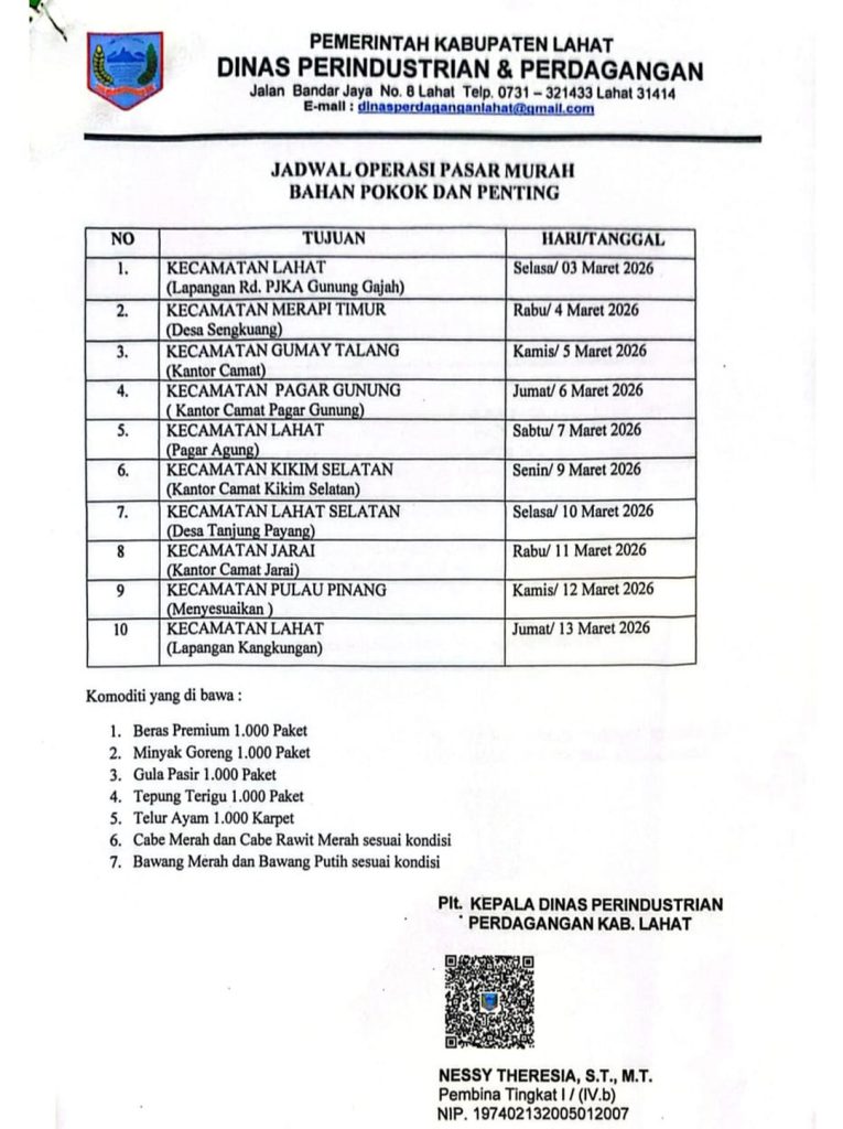 Kegiatan ini dijadwalkan berlangsung selama Maret 2026 dan menyasar 10 kecamatan di wilayah Kabupaten Lahat. Operasi pasar murah tersebut menyediakan berbagai kebutuhan pokok dengan harga terjangkau dan jumlah terbatas.