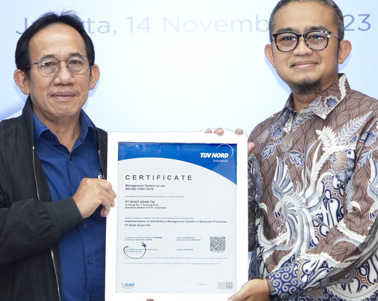 JAKARTA, MLCI – Sertifikasi Sistem Manajemen Anti Penyuapan (SMAP) ISO 37001:2016 berdasarkan hasil audit dari PT TUV NORD Indonesia selaku Badan Sertifikasi Independen. Sukses dipertahankan PT Bukit Asam Tbk (PTBA), anggota Grup MIND ID.