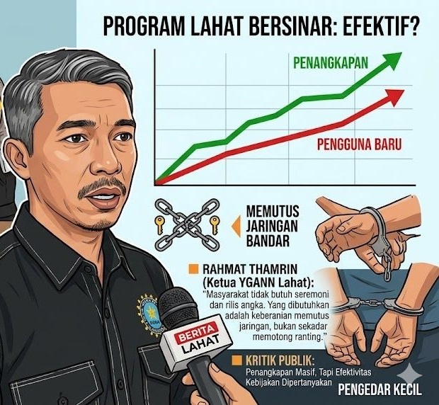 Sementara itu, Ketua Yayasan Gugus Anti Narkotika Nasional (YGANN) Lahat, Rahmat Thamrin, menyampaikan kritik yang lebih tajam terhadap pendekatan yang selama ini dilakukan.