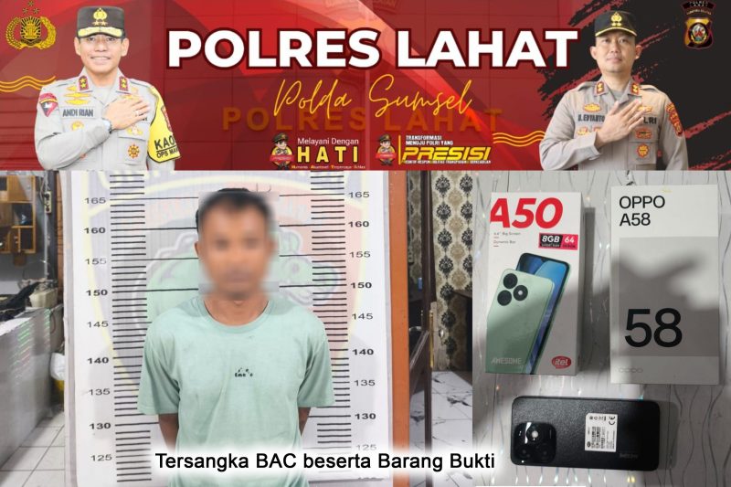 “Tersangka BAC berhasil diringkus di kontrakan tepatnya di Desa Lebak Budi Kecamatan Merapi Barat berikut barang bukti 1 unit handphone merek ITEL A50 dengan nomor Imei1: 355409390744948, Imei2: 355409390744955 dan 1 buah kotak handphone Mreka Oppo A58 dengan nomor Imei1: 865813066061979, Imei2: 865813066061961 serta 1 buah kotak handphone ITEL A50 dengan nomor Imei1: 355409390744948, Imei2 : 355409390744955,” beber Lispono.