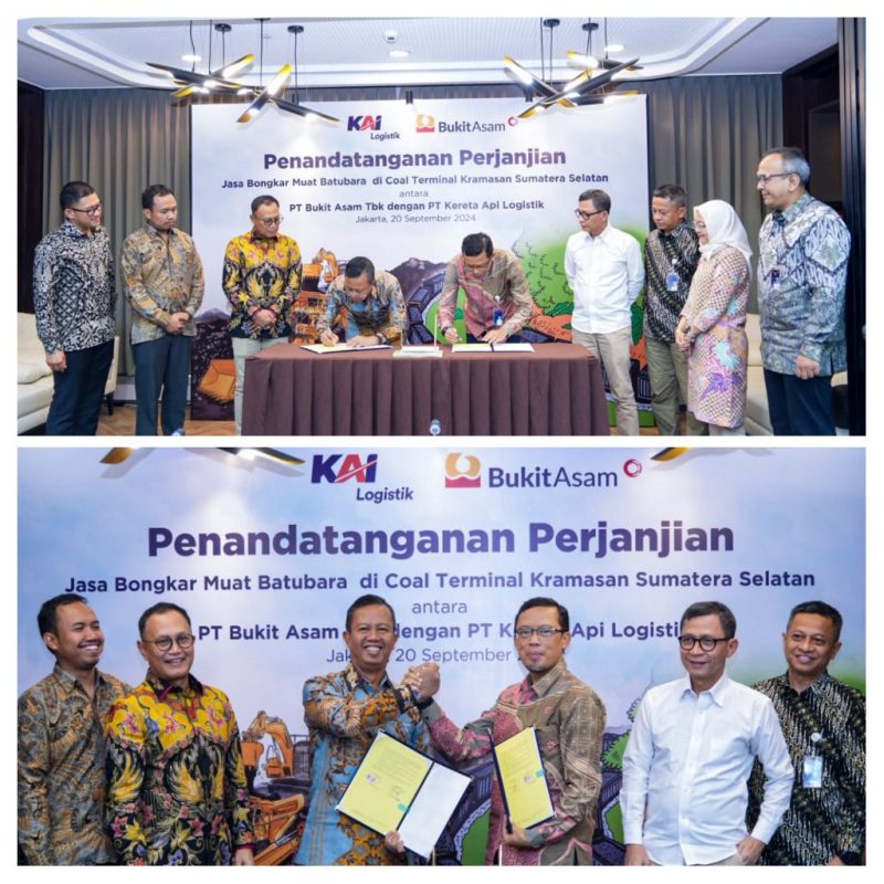 JAKARTA, MLCI – PT Bukit Asam Tbk (PTBA) dan PT Kereta Api Logistik (KAI Logistik), anak usaha PT Kereta Api Indonesia (Persero) yang menawarkan jasa logistik termasuk penunjangnya, menandatangani perjanjian tentang jasa bongkar muat batu bara di Terminal Batu Bara Kramasan.