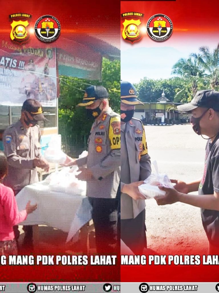 Informasi terangkum, kegiatan Kapolres Lahat beserta seluruh PJU Polres Lahat diawali pembagian nasi kotak sebanyak 250 kotak yang terbagi dalam 5 lokasi dengan sasaran masyarakat yang terkena dampak Covid-19 dan masyarakat yang kurang mampu.