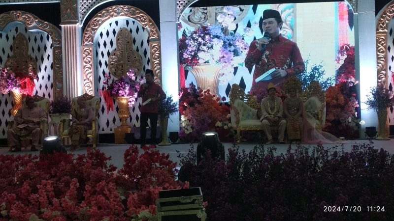 LAHAT SUMSEL – MLCI – Penuhi undangan resepsi pernikahan Harits dan Tian di Gedung Kesenian Kota Lahat, Yulius Maulana disambut hangat oleh keluarga kedua memoelai berserta para tamu undangan lainnya, Sabtu (20/07/2024).