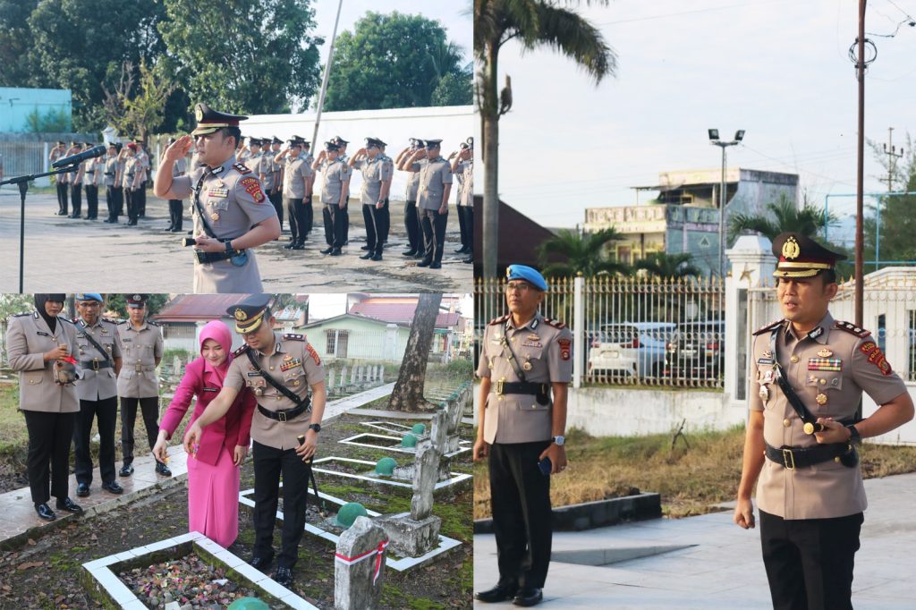 Kapolres AKBP Novi Edyanto SIK. MIK, dan rombongan mengikuti rangkaian kegiatan secara khidmat, mulai dari Penghormatan, Peletakan karangan bunga, hingga tabur bunga di Pusara para Pahlawan.